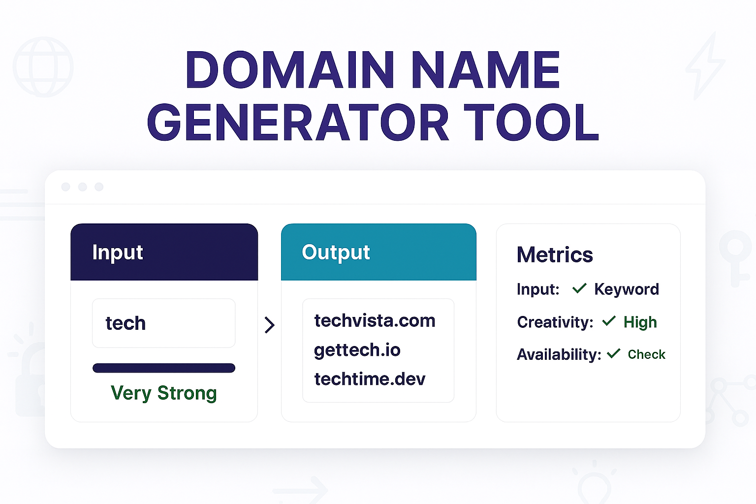Don't let a great idea die because you can't find a name for it. Use our free Domain Name Generator to brainstorm hundreds of creative, brandable, and available domain ideas in seconds. Find your perfect name and start building your project today.